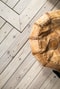Genom en säkerhetsdörr kommer vi in i hallen som har vitsåpade brädgolv och vitmålade väggar. Här finns en inbyggd garderob och plats för avhängning.