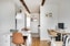 Vardagsrum - Ljust rum med parkettgolv och ljusa väggar. Här finns plats för både soffgrupp och matbord. Takfönster bidrar med fint ljusinsläpp och förstärker den luftiga känslan, medan synliga bjälkar ger bostaden charm.