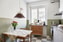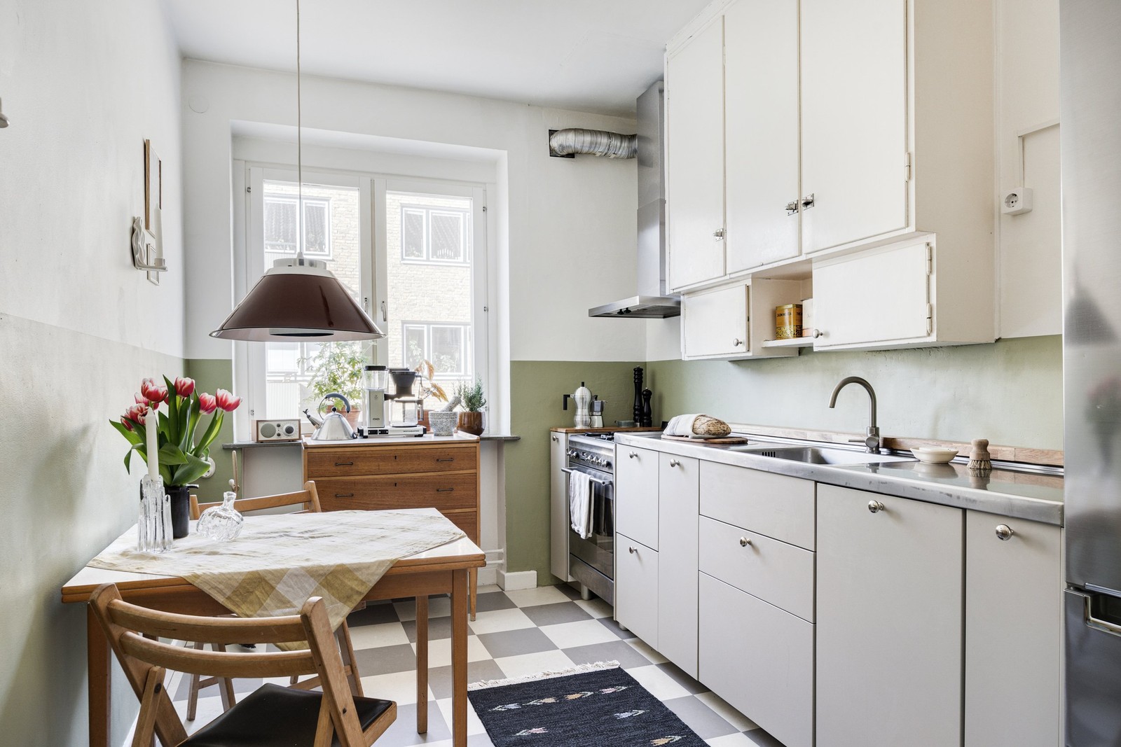 Kök - Köket från 2025 är stilrent med gråbeige och vita skåpsluckor samt rostfri bänkskiva. Rutiga linoliumplattor på golvet samt vitvaror enligt följande: Gasspis (Smeg -21), varmluftsugn (Smeg -21), kyl/frys (LG), mekaniskt fläkt (Ikea -21) samt diskmaskin (Ikea -25).