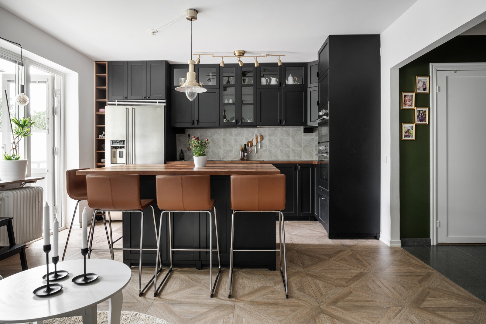 Via hallen når vi köket som ligger i öppen planlösning med sällskapsrummet. Modernt kök från Ikea med svarta luckor i pressat trä, bänkskiva i asp med fiskbensmönster och fint grått kakel baktill.