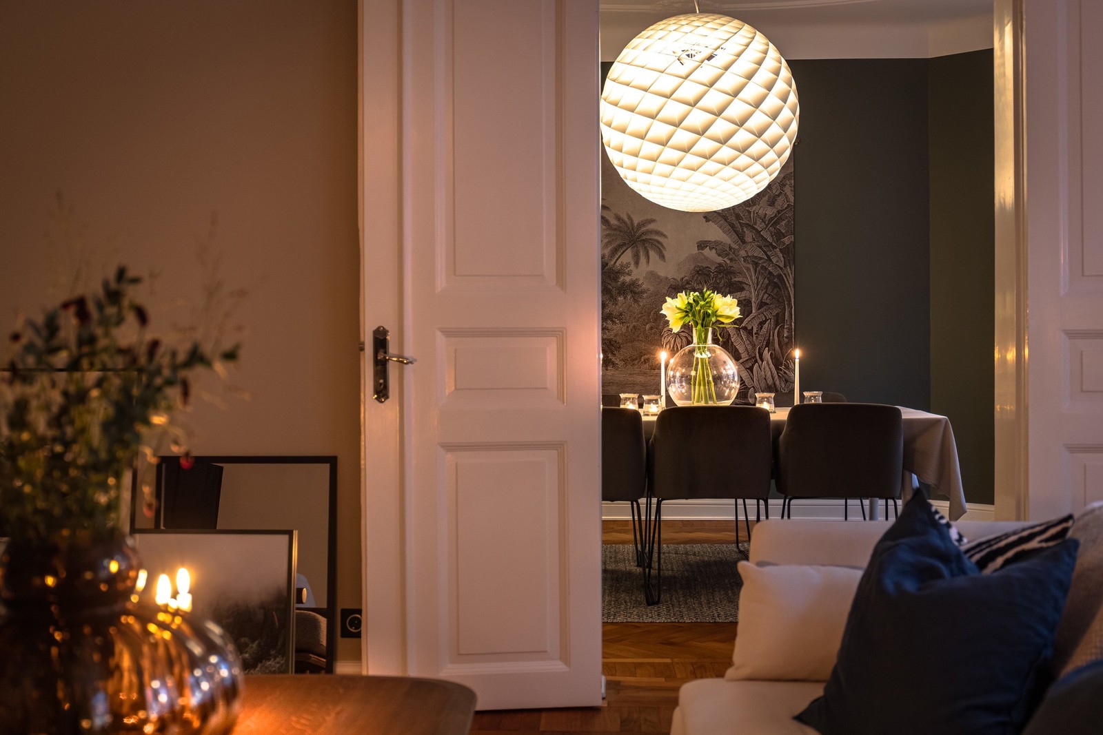Ljust, luftigt och elegant med fiskbensparkett, beige väggar och tidstypisk stuckatur – en naturlig samlingsplats att trivas i.