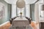 Ett rofyllt sovrum med ljus heltäckningsmatta, dämpad gråblå väggkulör och platsbyggda garderober. Utgång till balkongen och utsikt mot gården skapar en lugn och behaglig atmosfär.