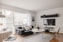 Ett härligt och ljust rum som är en öppen social avdelning med kök, matplats och vardagsrum i ett. Köksinteriör med beige luckor och extra tjock bänkskiva med sockel och kantlist i aluminium. Ovanför arbetsbänken är väggen klädd med mörkgrått kakel. Komplett vitvarupaket från Electrolux i rostfritt. Här har man verkligen nyttjat utrymmet hela vägen upp till tak vilket ger extra mycket förvaringsutrymme. Avdelningens volym tillåter både en matplats och soffgrupp. Massor av ljus strömmar in genom de stora fönsterpartierna som vetter utåt terrassen. Även här återkommer parkett och målade vita väggar.
