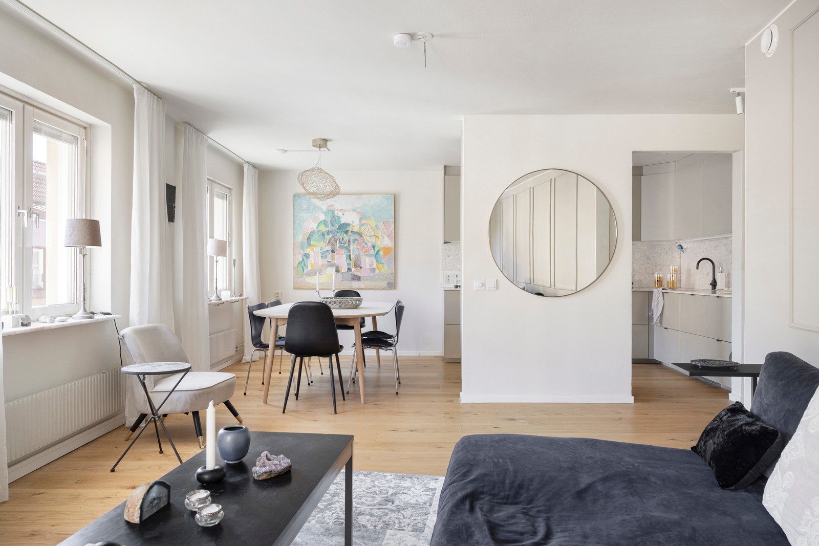 Bostaden genomgick under 2022 en renovering av kök, badrum och gäst-wc tillsammans med nya golv och renovering av ytskikt/väggar. Genomgående i bostaden finner vi ett stilrent parkettgolv i en-stav ek som fint harmonier med släta väggar målade i ljusa toner.