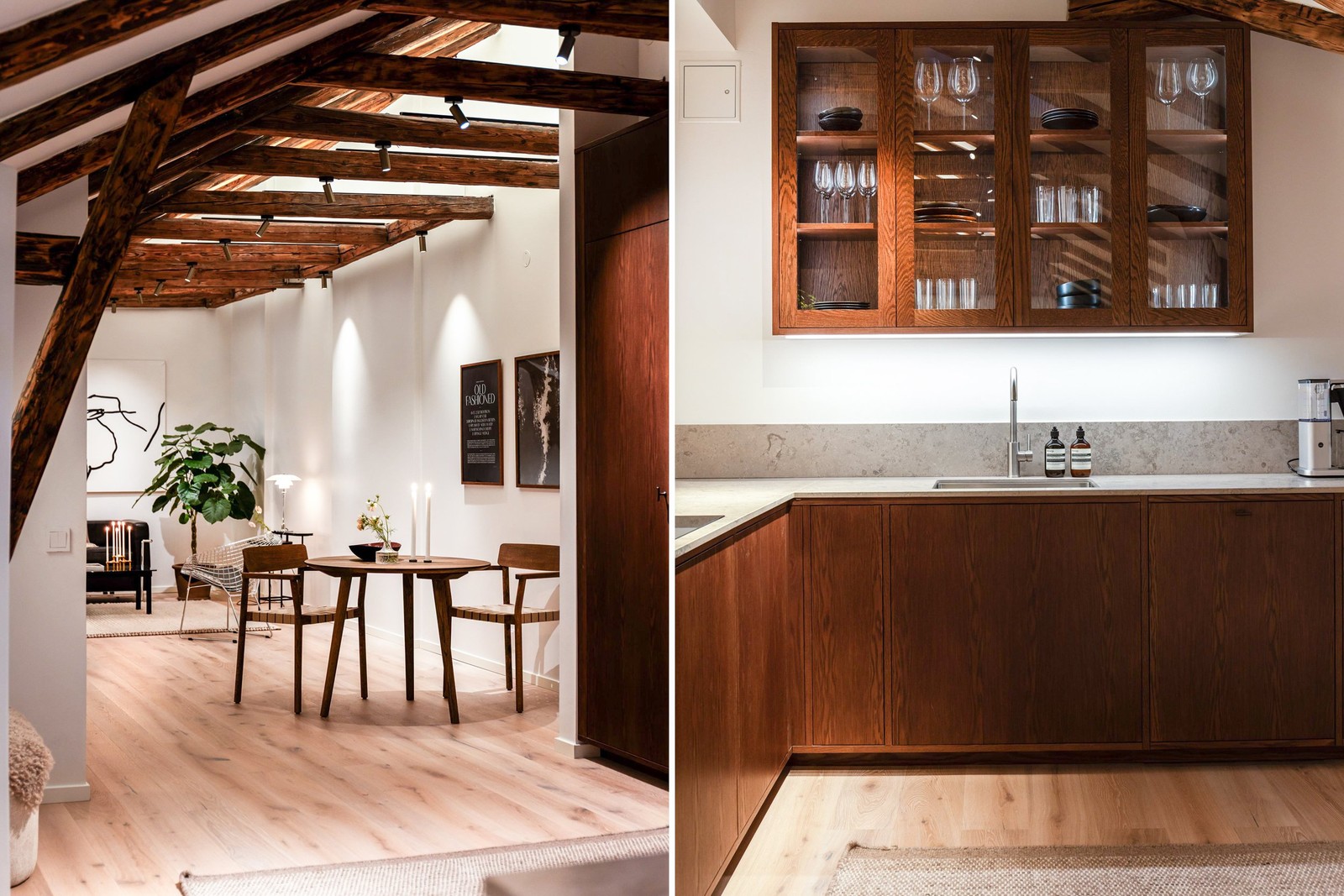 Lägenheten har generöst med sovutrymmen, ett stilrent helkaklat badrum samt ett ljust och inbjudande vardagsrum med charmiga trägolv och synliga takbjälkar som ger rummet en unik karaktär. Ljuset strömmar in genom generösa fönster och skapar en varm, inbjudande atmosfär.