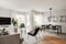 Modernt och stilrent kök med släta vita luckor, rostfria maskiner och grå bänkskiva med kaklade väggytor ovanför i svart. Här har du ständig kontakt med sällskapsrummet. Även här återkommer ekparketten och målade väggar i ljusgrått.