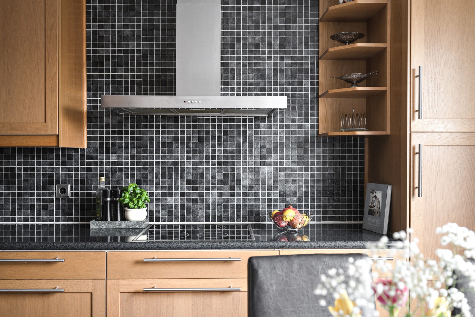 Det moderna parallellköket är inrett med träskåp och en mörk bänkskiva som kontrasterar snyggt mot mosaikens stilfulla stänkskydd. Här finns gott om plats för både matbord och stolar, vilket skapar en trevlig matplats för familj och vänner. Köket är fullt utrustat med kyl, frys, diskmaskin, mikro, ugn, fläkt och spishäll.
