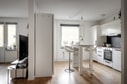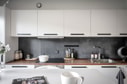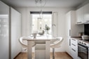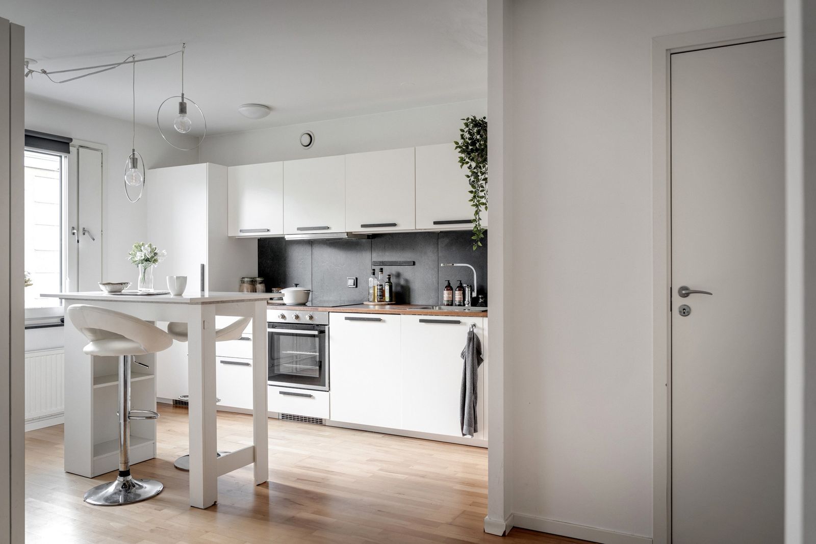 Det välutrustade köket bjuder in till gemensamma måltider med plats för 4-6 personer. Här finns gott om arbetsyta och förvaring i fina vita köksluckor och en praktisk bänkskiva i laminat. Köksutrustningen, inklusive ugn, spis, kyl och frys, möjliggör en bekväm matlagning. De ljusa väggarna och det genomgående laminatgolvet skapar en enhetlig och trevlig atmosfär. Skjutdörrsgarderober i köket bidrar till extra smart förvaring.