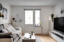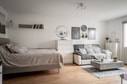 Det rymliga vardagsrummet välkomnar till avkoppling och social samvaro. Här finns gott om plats för en bekväm soffgrupp, soffbord och tv, samt möjlighet att arrangera en större säng om så önskas. De ljusa väggarna och det fortsatta laminatgolvet skapar en ljust och luftigt utrymme.