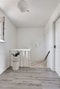 Sovrum: Ljust sovrum med laminatgolv och väggar i vit färg.