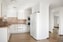 Öppet och rymligt kök med parkett och matplats för minst 8-10 personer i semi-öppen planlösning mot vardagsrummet. Från matplatsen finns utgång direkt till den inglasade balkongen med vacker utsikt. Här finns ljusa väggar, fina köksluckor, bänkskiva i trä och kakel ovan som stänkskydd. Utrustat med spishäll, ugn, mikro, diskmaskin, fläkt, kyl och frys.