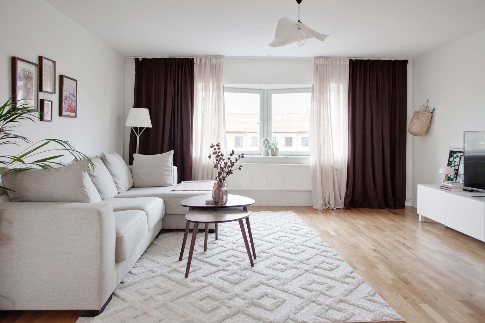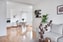 Vardagsrummet är luftigt och harmoniskt, tack vare den öppna planlösningen mot köket och matplatsen. Här framhävs rummet av ljusa väggar, ett vitt tak och golv i ekparkett. Det charmiga burspråket med stora fönster ger inte bara rikligt med ljusinsläpp utan också en stilfull detalj med dess breda fönsterbräda i sten.