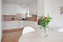 Köket är öppet och inbjudande, med plats för minst sex personer vid matbordet. Det ligger i öppen planlösning mot vardagsrummet och bjuder in till social samvaro. Ljusa målade väggar och ett vitt tak kompletteras av köksluckor i fint utförande, en bänkskiva i laminat och ljust kakel som stänkskydd. Köket är utrustat med kvalitativa vitvaror från Bosch, inklusive spishäll, inbyggnadsugn och kyl och frys i fullhöjd. Det finns även förberett för installation av en diskmaskin. Från köket når du den stora inglasade balkongen, en perfekt plats att njuta av morgonkaffet med en vacker utsikt.