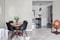 Den öppna planlösningen mellan kök och vardagsrum ger bostaden generösa sociala ytor. Här finns plats för soffa och matplats. På golvet ligger ljust pigmenterad stavparkett i holländskt mönster, väggarna är målade i en beige ton.