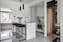 Inredningen från Ikea går i grått och matchas stilrent med bänkskiva och stänkskydd i marmor. Svart knoppar ger en fin kontrast. Köksön bistår med bra arbetsytor och fungerar även som en umgänges med plats för 3 barstolar. Förvaring i över- och underskåp samt i skafferi/vinrum med glasdörr. På golvet ligger klinker i gråmelerad ton, väggarna är målade i en ljus ton.