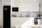Köket är välplanerat med god förvaring och arbetsytor. Inredningen går i vitt och ovan bänkskivan i laminat löper ett snyggt vitt kakel. Maskinparken från Bosch är komplett med kyl, frys, inbyggd ugn, mikro, diskmaskin samt induktionshäll från Franke.