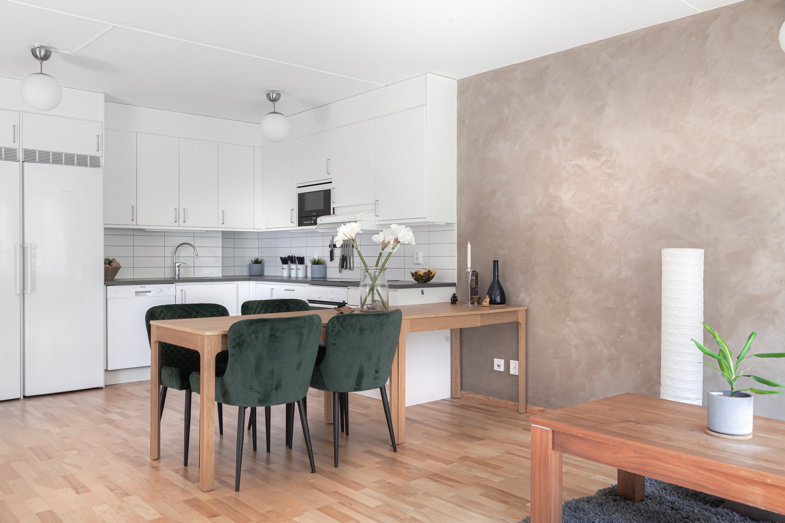 Den öppna planlösningen gör det enkelt att inreda med en stor soffgrupp och en matplats för större sällskap. Här finns en vacker kalkvägg och från vardagsrummet nås den stora balkongen i österläge. Balkongen på över 14 kvadratmeter fungerar som en naturlig förlängning av vardagsrummet, med utsikt över sedumtak och trädkronor.