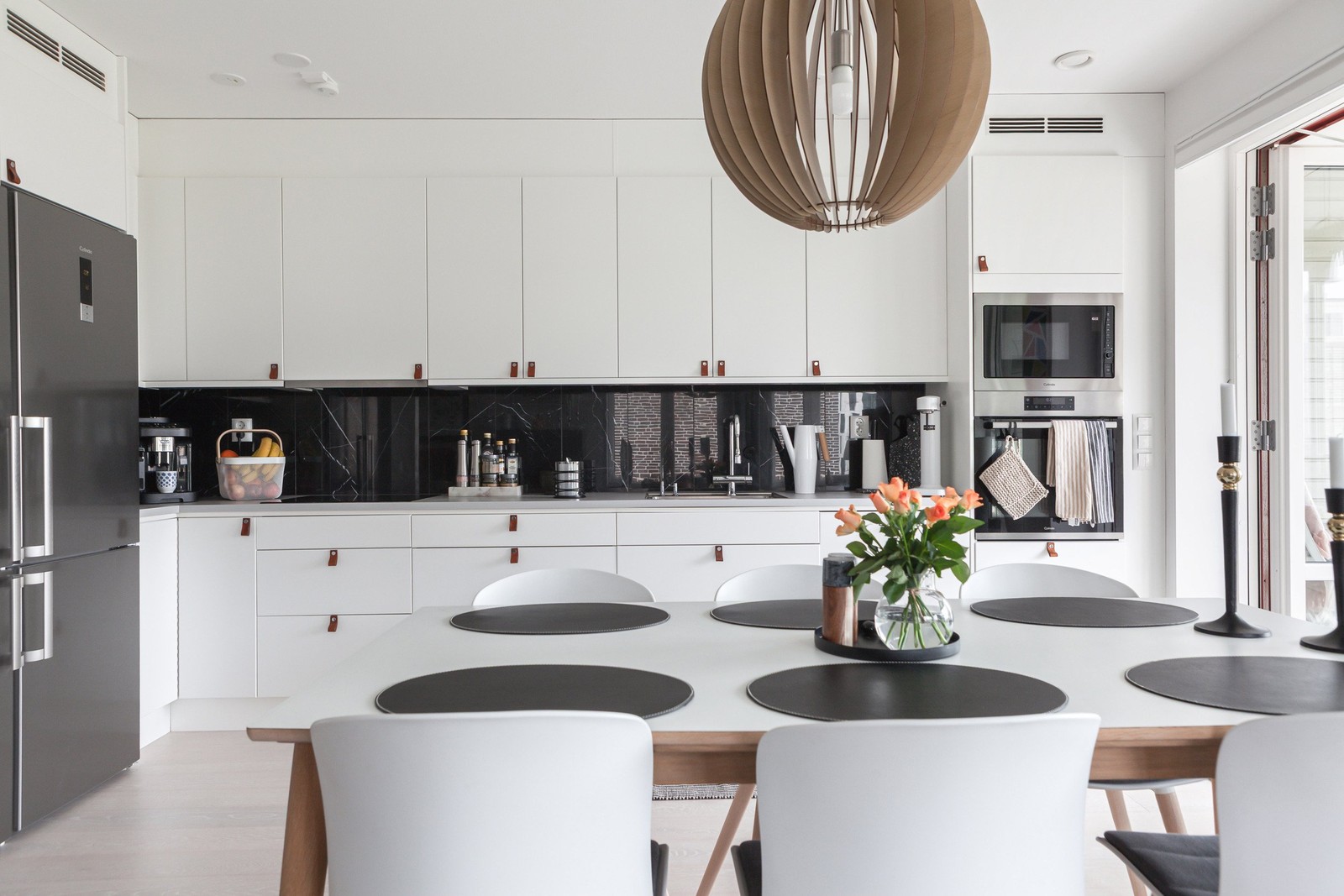 Det stilfulla vinkelköket har vita skåpsluckor som harmoniskt kombineras med svart kakel och en ljus bänkskiva. Här finns gott om förvaringsutrymme samt generösa arbetsytor. Köket är utrustat med ugn, spishäll, diskmaskin, mikro, två kylskåp och två frysar.