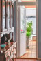 Entrén nås genom husets karaktäristiska glasparti och ger ett första intryck av bostadens ljus och öppna känsla. Här finns plats för avhängning och förvaring i garderober och golvet övergår från klinker vid entrén till parkett som sedan löper vidare genom bostaden tillsammans med målade väggar.