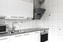 KÖK - Fint kök med släta vita luckor och vitt kakel ovan bänkskiva. Induktionshäll, fläkt, ugn, kyl/frys. Släta vitmålade väggar och parkettgolv.