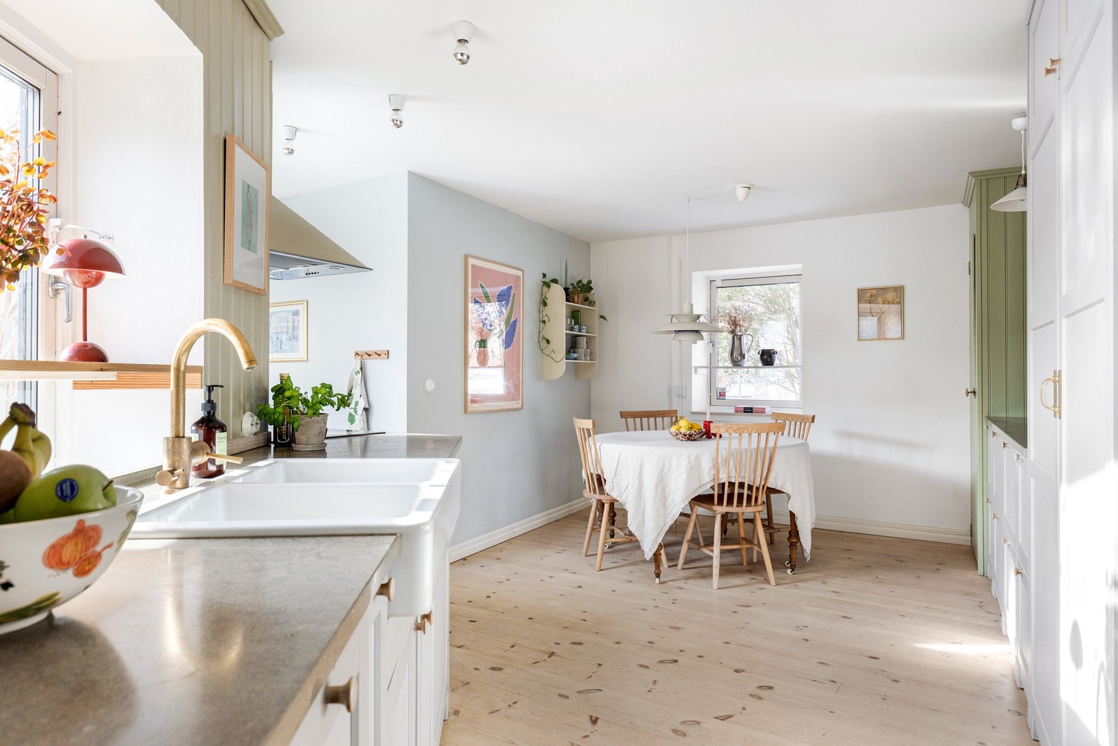 Köket, hemmets självklara hjärta, bärs av det genomgående trägolvet som löper vackert genom hela huset och skapar en varm, sammanhållen känsla. Väggarna är målade i mjuka nyanser med bl.a. linoljefärg och köksluckorna i grön/grå pärlspont harmonierar med en blåmålad vägg som ger rummet karaktär. Bänkskiva i sten tillför en naturlig elegans. Här finns plats för sex personer runt bordet – för långa frukostar i morgonljus och middagar som dröjer sig kvar där man kan sitta och smygtitta på hundarna som tar aina kvällspromenader i parken utanför. Köket är utrustat med induktionshäll från Siemens, varmluftsugn och diskmaskin från Ikea – en fin balans mellan modern bekvämlighet och lantlig charm.