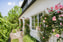 Trädgården är en och blomstrande och lummig plats, insynsskyddad med kraftiga syrenbuskar och fleråriga rosor som klär fasaden likt en blommande vägg. En plats för både avkoppling och sociala stunder.