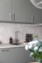 Köket, som renoverades 2020, bjuder in till både vardag och fest. De grågröna luckorna från Ikea ger en modern och harmonisk känsla, och här finns gott om plats för ett matbord där upp till sex personer kan samlas för middagar, läxläsning eller långa frukostar på helgen. Intill ligger vardagsrummet, även det renoverat 2020, med vita väggar och en stilfull fondvägg i betongfärg som skapar en varm och samtida atmosfär.