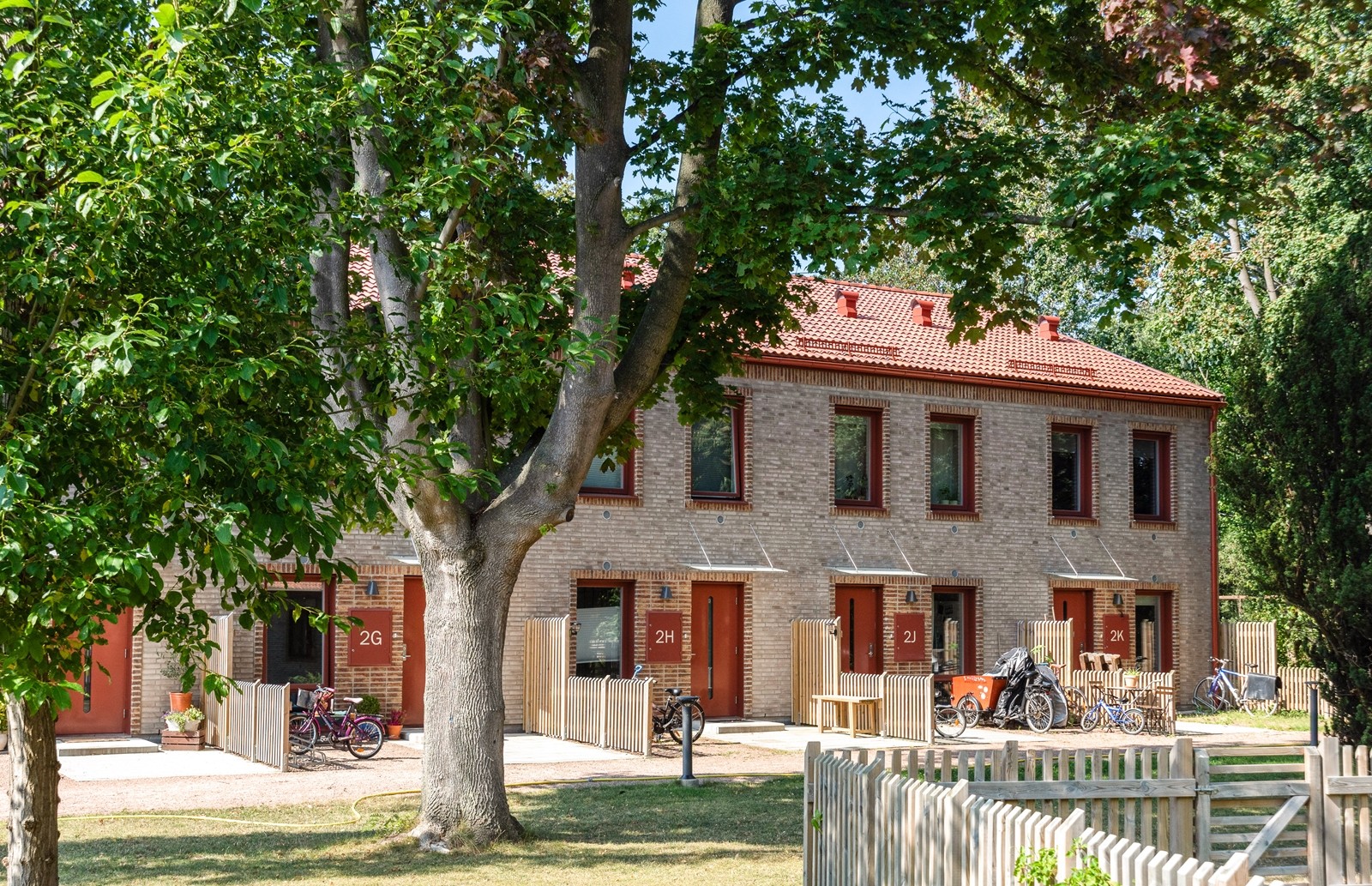Radhusområdet består av tre luftigt placerade huslängor med fem bostadsrätter i varje. Inbäddat bland grönska och en njutbar utsikt över den grönskande omgivningen. Skogen intill har förvandlats till en vacker park, vilket förhöjer boendekvaliteten ytterligare.