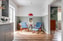 Målat brädgolv, vita väggar varav en snedvägg är tapetserad.