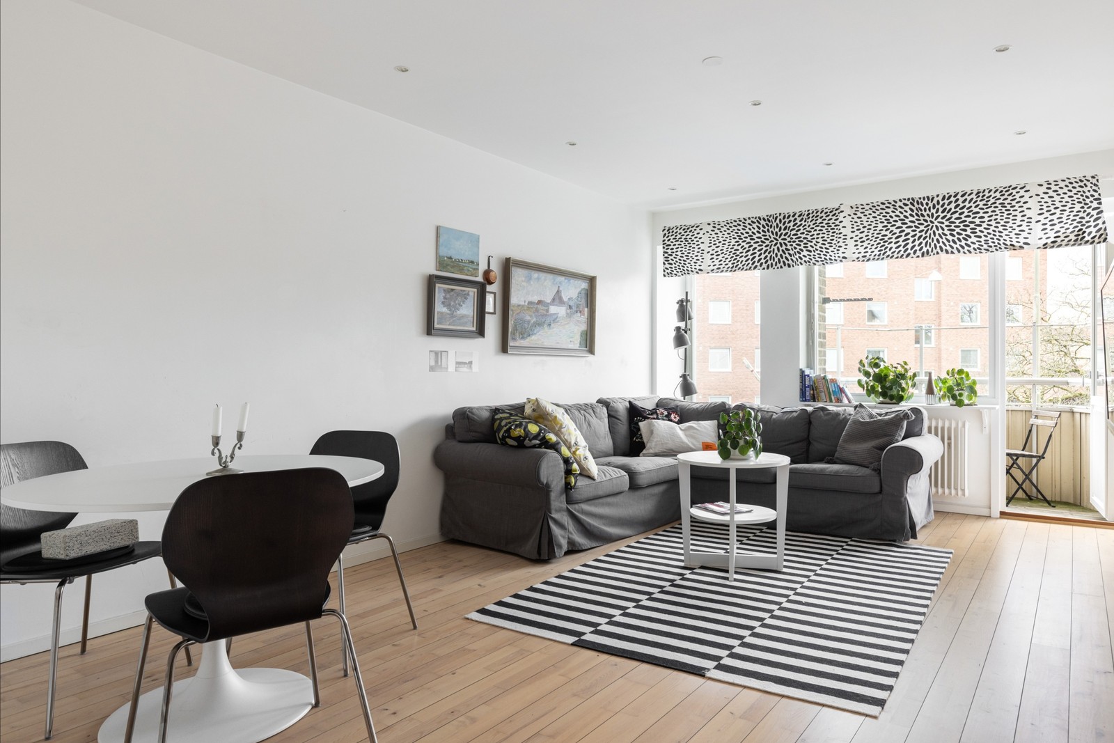 På andra våningen med hiss från markplan möts du av en stilren boendemiljö där väldisponerade kvadratmeter fördelar sig över kök, vardagsrum, sovrum och badrum. Köket är fint renoverat och fullt utrustat med allt man önskar och här erbjuds plats för matbord för fyra personer. Fint ljusinsläpp i sällskapsrummet från stora fönsterpartier i söderläge. Här når vi även balkongen i samma väderstreck. Sovrummet ligger mysigt placerat mot föreningens innergård. Plats för dubbelsäng och kontor. Här erbjuds en hel garderobsvägg med skjutdörrar.