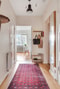 Välkomnande hall med säkerhetsdörr, trägolv och vita målade väggar. Här finns praktisk förvaring i garderob.