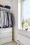 Genomgående vitpigmenterad ekparkett, enstav. Spotlights med dimmer (badrum och kök), golvvärme (bottenvåning), vita släta innerdörrar, fönsterbrädor i sandfärgad kalksten, skjutdörrar med spegelglas i hall. Under trappan finns smart förvaring.