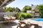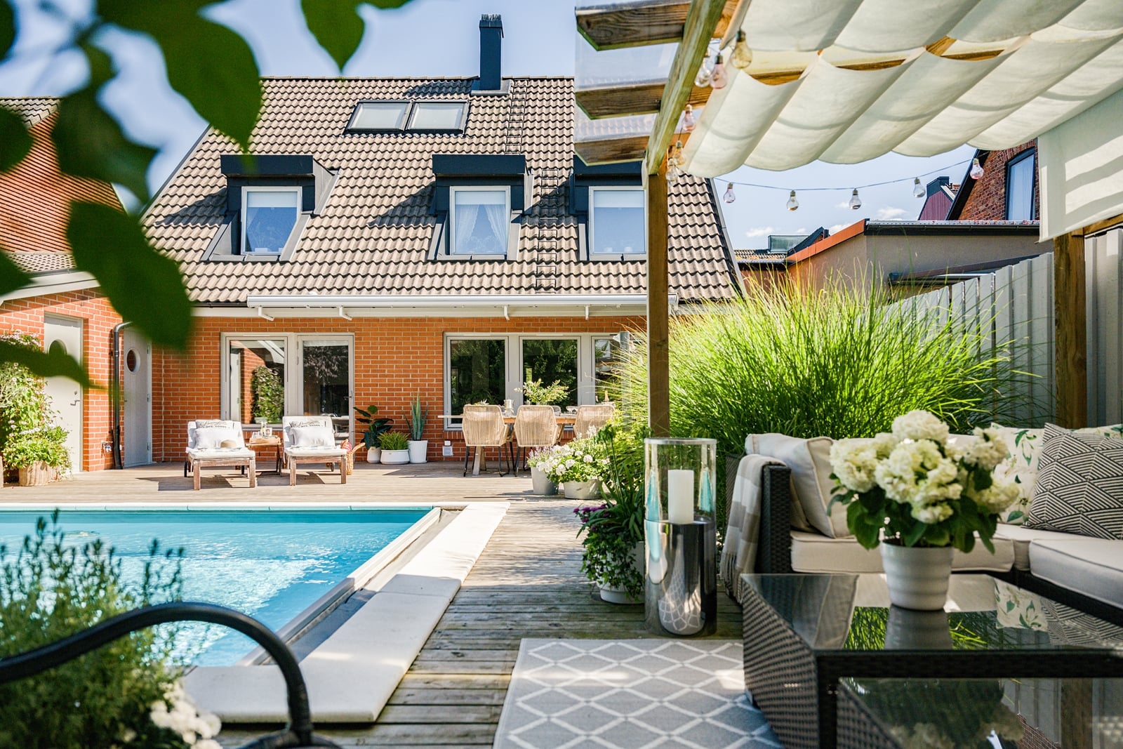Pool, trädäck, gräsmatta, pergola