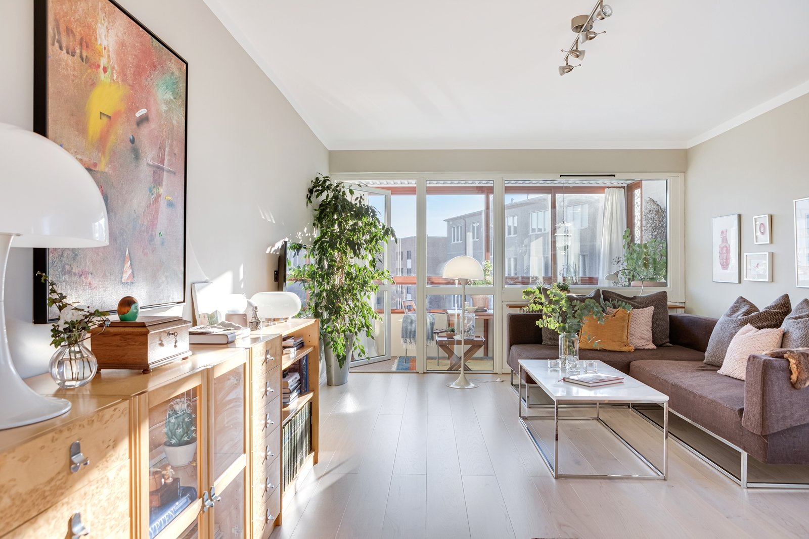 Det vitpigmenterade golvet från Kährs tillsammans med sandgrå väggar skapar en mjuk och harmonisk bas. Rummet erbjuder gott om plats för både soffgrupp och matbord och bjuder in till såväl lugna kvällar som sociala tillställningar. Härifrån når du den inglasade balkongen i soligt söderläge – en förlängning av hemmet med utsikt över föreningens gröna och välskötta innergård.