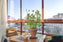 Stor inglasad balkong med fri utsikt över föreningens trädgård.
