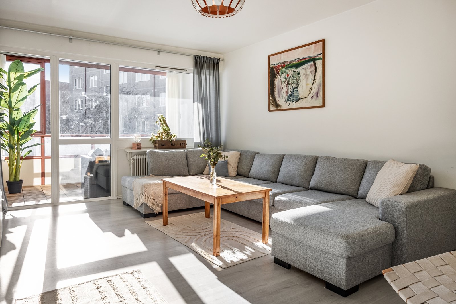 Redan när du kliver in möts du av en ljus och hemtrevlig känsla. Vardagsrummet är generöst tilltaget med ljust laminatgolv och vita väggar som skapar en luftig bas att inreda efter. Här finns gott om plats för både en inbjudande soffgrupp och ett matbord för middagar med vänner. Från rummet nås bostadens soliga uteplats/balkong i sydvästläge – en privat oas med utsikt över den gröna gården, helt utan insyn. En självklar plats för morgonkaffet såväl som sommarkvällar i solen.