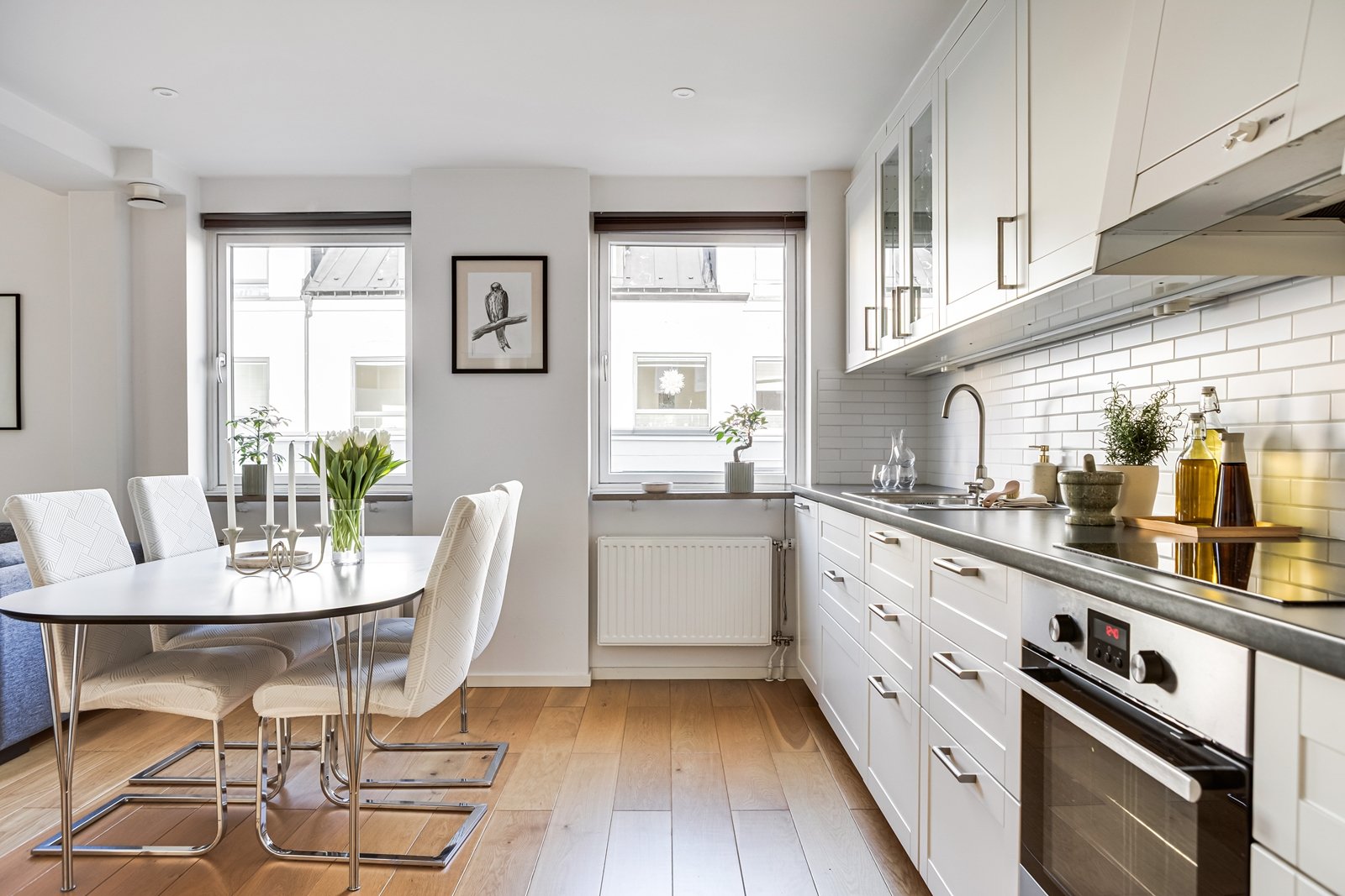 Lägenheten präglas av ett öppet och ljust uttryck där hallen naturligt öppnar upp mot vardagsrum och kök. Ekparkettgolv och vita väggar skapar en tidlös och harmonisk bas som låter ljuset flöda fritt genom bostaden. Vardagsrum och kök med matplats flätas samman i en social och välplanerad yta, perfekt för både vardag och umgänge. De stora fönsterpartierna ger ett generöst ljusinsläpp och den franska balkongen sätter en extra guldkant på rummet.