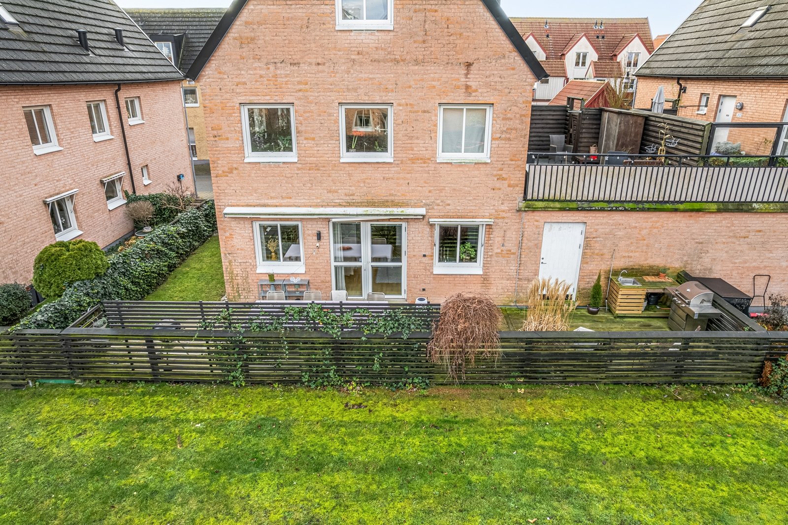 Stort trädäck om ca 35 kvm knyts samman med gräsmatta längs husets gavel. Här njuter man av egen trädgård som bjuder på både sol och skugga under dagen. Trädäcket bjuder plats för stort matbord och gräsmattan bjuder in till odling, avkoppling eller lek.