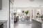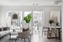 Öppen planlösning mellan kök och vardagsrum med genomgående vitlaserad parkett golv och väggarna går i vita släta toner som ger en tidlös bas att inreda efter.