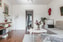 Plats för mindre bord intill fönstret. Köket är utrustat med spishäll, ugn, varmluftsugn, kyl, frys, kolfilterfläkt och diskmaskin.