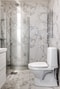 Badrummet är påkostat och helkaklat i exklusiv marmor. Här finns allt du behöver för vardagslyx – dusch med vikbara glasväggar, handdukstork, WC, kommod med förvaring samt spegelskåp med belysning.