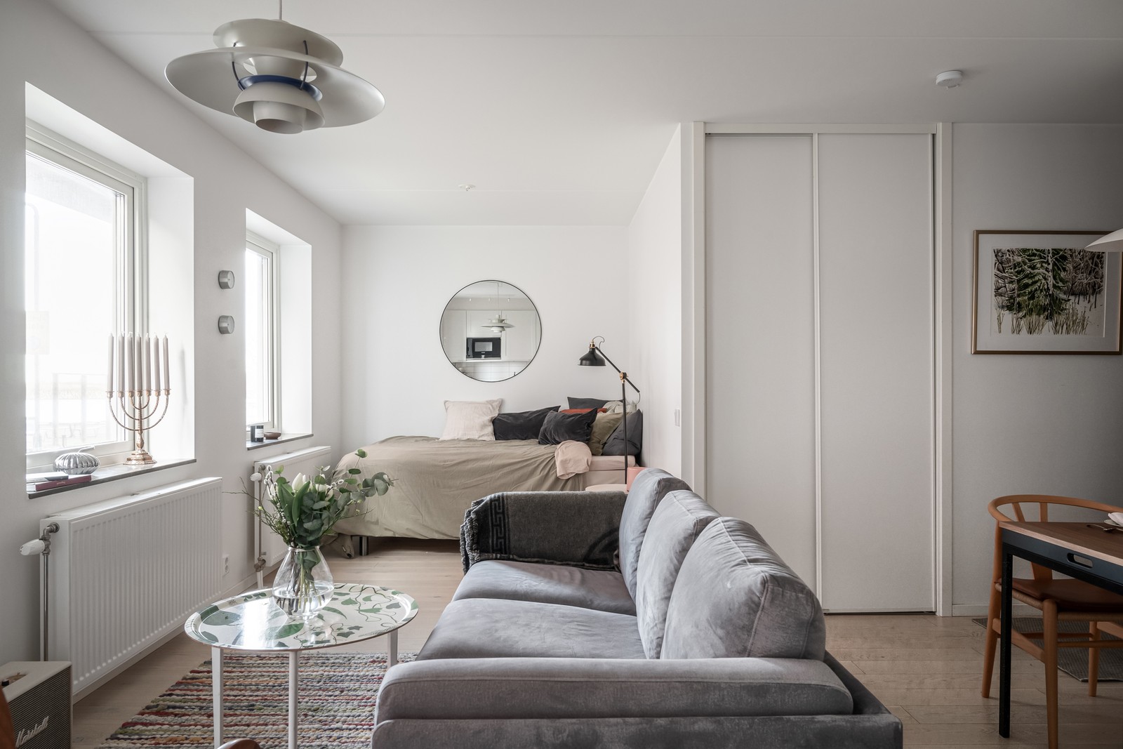Vardagsrum och kök samspelar i en öppen atmosfär där ytan ger plats åt såväl soffa som matbord. Från köket kan du öppna upp dubbeldörrarna till din franska balkong.