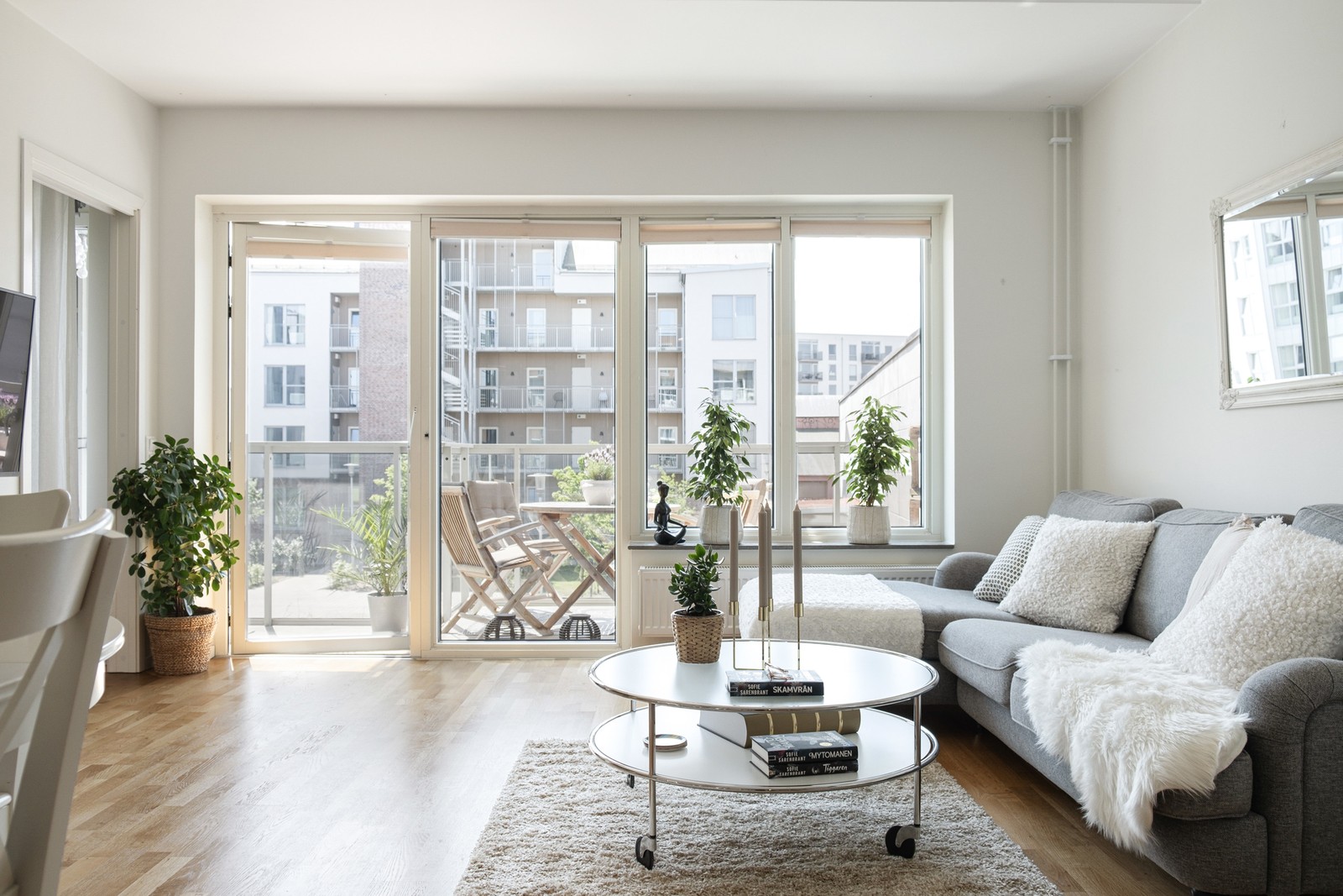 Inbjudande socialt rum som ligger i öppen planlösning med köket. På golvet vilar ett parkettgolv och väggarna är vita. Rummet har en härlig volym för många gäster, både sittande vid middagsbord och i soffor. Rummet får ett härligt ljusflöde från ett stort fönsterparti och här når vi även bostadens stora balkong i bästa solläge.