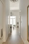 Säkerhetsdörr. Vitpigmenterat 3-stavs parkettgolv och vita väggar. Stora skjutdörrsgarderober.