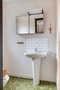 I anslutning till hallen ligger en praktisk toalett med våtrumsmatta på golvet och våtrumstapet på väggarna. Utrustad med toalett och handfat.