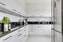 Stilrent kök med samma genomgående ljusa golv och vita väggar. Tidlösa vita köksluckor kombineras med en mörk stenskiva som skapar en elegant kontrast. Köket är fullt utrustat med spishäll, fläkt, diskho, diskmaskin, kyl och frys samt mikro och ugn. Här finns även en rymlig matplats med utrymme för 6–8 personer, perfekt för både vardag och fest.