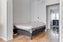 I anslutning till vardagsrummet går vi igenom sovalkoven. Även här finner vi fiskbensparkett på golvet och väggarna målade i vitt. Här får vi plats för både soffgrupp, garderob och liten matsalsdel.