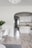 Modernt kök med gråa släta luckor och träbänkskiva. Öppen planlösning mot vardagsrummet, som är generöst och lättmöblerat.