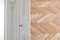 Luftig hall med gedigen ekparkett och vitmålade väggar. Till vänster finns en nisch för skor och ytterkläder och längre in en inbyggd garderob av god storlek som gör är idealisk för liten yta.