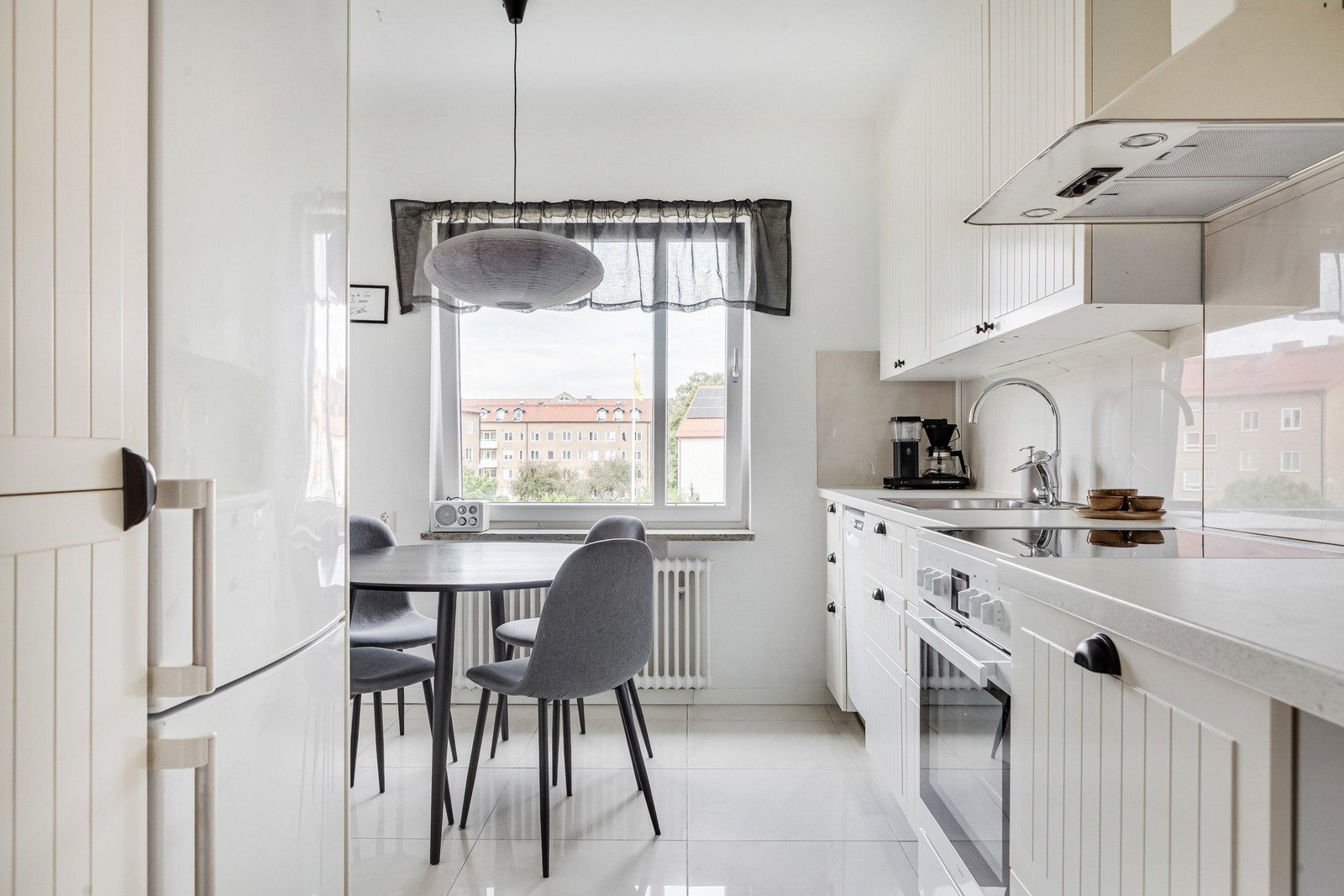 Stilrent kök i vitt från Ikea. I köket finns det plats för ett matbord om 4 personer. Köket är utrustat med kyl/frys, fläkt, diskmaskin, häll och ugn. Väggarna är målade vita och på golvet ligger snyggt klinker.